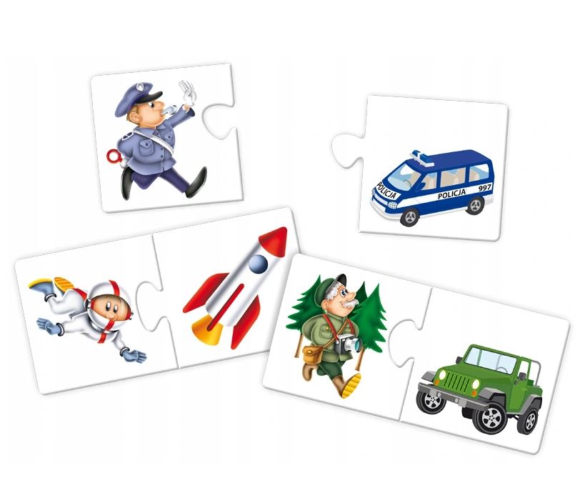Jakim wozem jeździ strażak? Czy astronauta ma specjalny pojazd? Kuferek zawody i pojazdy to świetna propozycja, dzięki której dziecko ma możliwość poznania zawodów oraz odpowiadającym ich zawodom. Różne kształty puzzli pozwalają także na świadomą kontrolę błędu i odpowiednie dopasowywanie elementów