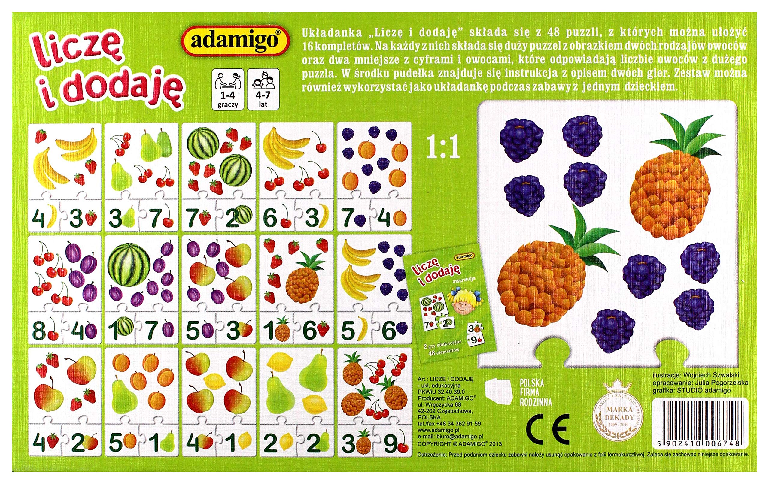 Układanka „Liczę i dodaję” składa się z 48 puzzli, z których można ułożyć 16 kompletów. Na każdy z nich składa się duży puzzel z obrazkiem dwóch rodzajów owoców oraz dwa mniejsze z cyframi i owocami, które odpowiadają liczbie owoców z dużego puzzla. W środku pudełka znajduje się instrukcja z opisem dwóch gier.