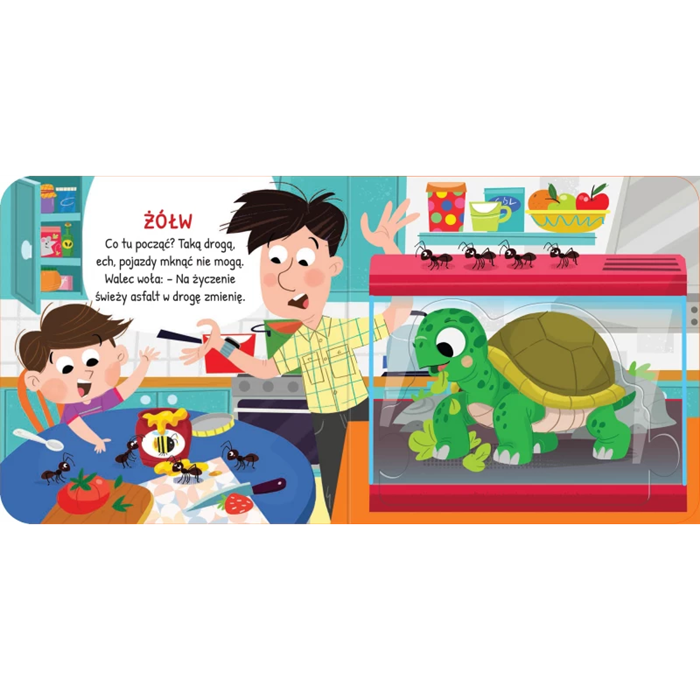 Jakie zwierzęta znajdę w tej książeczce? Książeczka zawiera ilustracje takich zwierząt jak kotek, chomiki, kanarek, żółw, mrówki, piesek i kret.