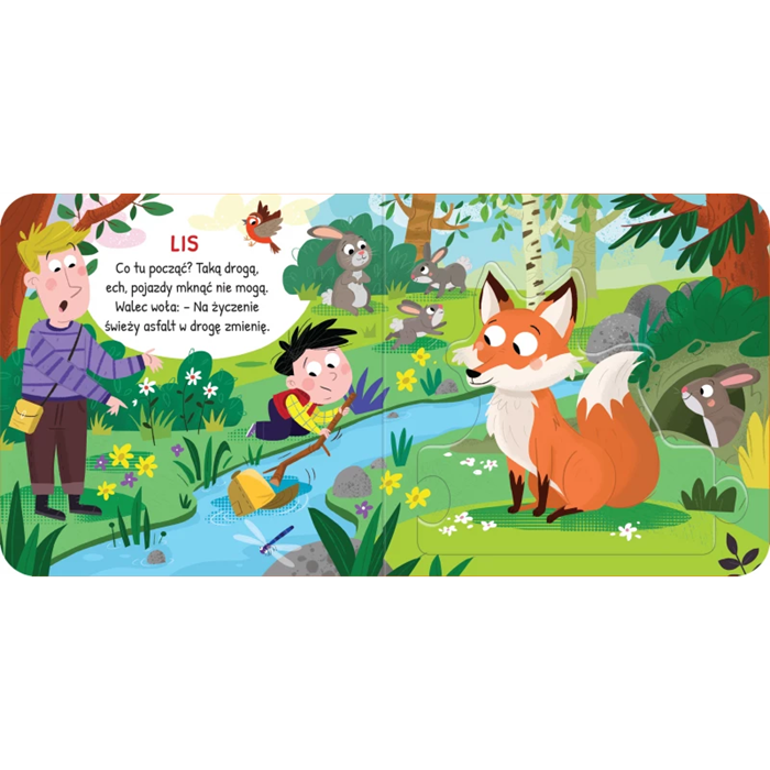 Jakie zwierzęta można znaleźć w tej książeczce? W książeczce znajdziesz m.in. niedźwiedzia, jeża, borsuka, pająka, dziki, wiewiórkę, dzięcioła, lisa, zające, jelenia, łanie i sowę.