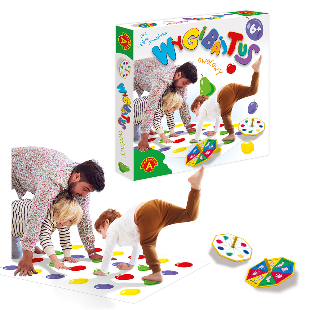 Wygibajtus Owocowy to dynamiczna gra ruchowa, która angażuje całe ciało każdego uczestnika. Idealna zarówno dla dzieci, jak i dorosłych, gwarantuje mnóstwo emocji oraz zachęca do aktywności fizycznej. Celem gry jest umiejętne stawianie stóp i dłoni na wyznaczonych polach planszy, zgodnie z kierunkiem wskazanym przez bączki.