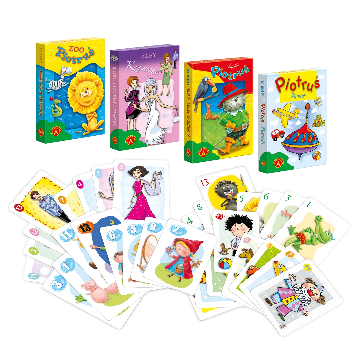 Zestaw 25 kart z obrazkami, dzięki którym można zagrać z dziećmi w dwie podstawowe gry karciane – „Piotruś” i „Pamięć”. Obie gry