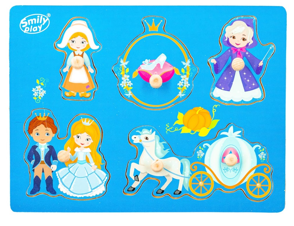 Układanka Kopciuszek SmilyPlay. Każdy element układanki posiada uchwyt, dzięki któremu dziecku łatwiej będzie układać puzzle.