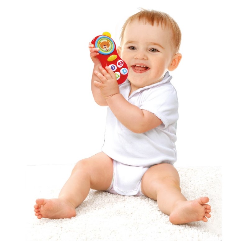 Telefon jest wielofunkcyjny, po naciśnięciu przycisku emituje odgłos wybieranego numeru telefonicznego, gra wesołe melodyjki i migocze światełkiem. 4 klawisze zapoznają maluszka z pierwszymi cyferkami (1,2,3,4), a także kształtami: koło, serduszko, trójkąt i kwadrat. Uśmiechnięta buzia Misia zachęca do zabawy. Antenka - uszko spełnia funkcję gryzaczka. Wykonana jest z bezpiecznych dla dzieci materiałów.