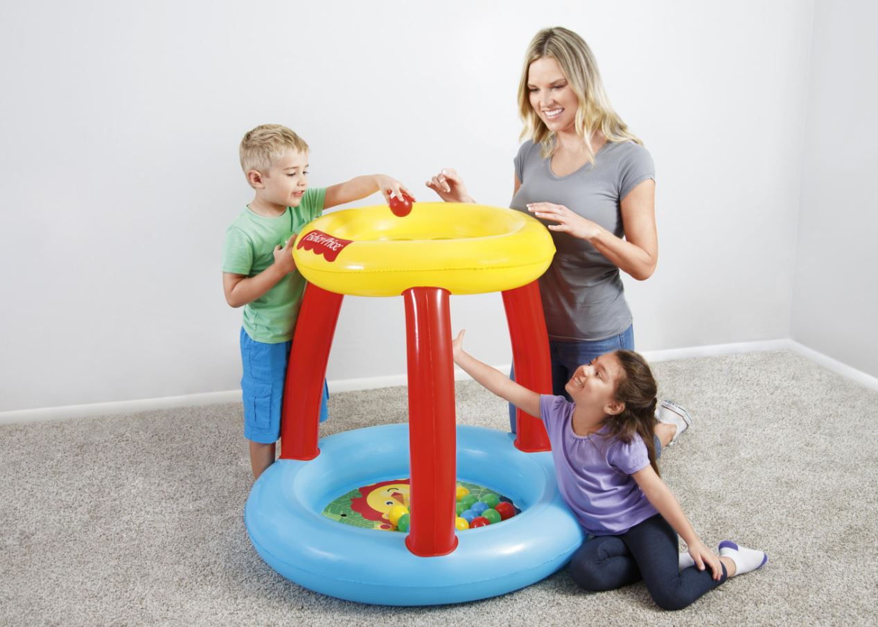 Dmuchany basenik z piłkami dostarczy najmłodszym fantastycznej zabawy! Urocze, kolorowe zwierzątka przyciągną wzrok każdego dziecka. Zamontowany daszek z otworami pozwoli na ciekawą rozrywkę. Dzieci mogą ćwiczyć celność lub urządzić zawody w rzuceniu większej ilości piłeczek.