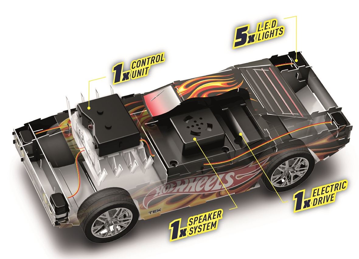 Niesamowity, wyścigowy, kreatywny a nawet… naukowy! Złóż kultowego Rodger Dodgera i sprawdź jakie ma niesamowite płomienie na „karoserii”. Model pojazdu po zmontowaniu ma aż 22 cm długości! A teraz dodaj trochę techniki: silnik, ze specjalnym głośnikiem i światłami LED, które zmieniają kolory. To zdecydowanie ożywi ten projekt STEM. Ten samochód to idealny zestaw dla młodych naukowców! Całość wykonana w klimacie oddającym markę Hot Wheels oraz z bezpiecznych i trwałych materiałów. Wjedź w świat nauki razem z czadowym Rodger Dodgerem!