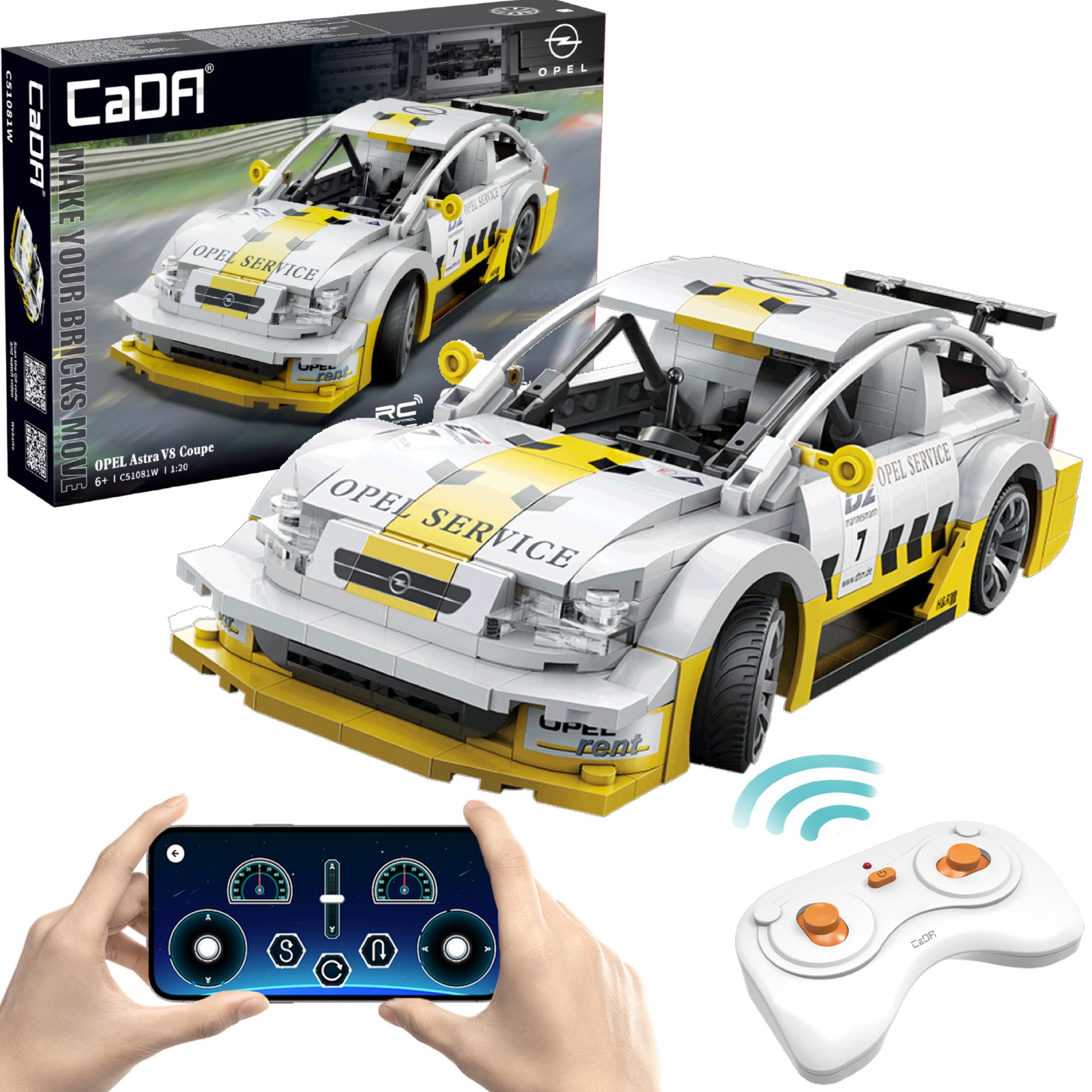 Zestaw składa się z 330 elementów i umożliwia samodzielne złożenie zdalnie sterowanego auta wyścigowego Opel Astra V8 Coupe w skali 1:20. Pojazd stworzony został ze szczególną uwagą na detale, które zapewnią niesamowitą zabawę. Wyposażony został w 4 gumowe koła, które umożliwiają mu poruszanie się po różnych powierzchniach. Samochód ma biało-żółtą karoserię z czarnymi elementami. Produkt na licencji.