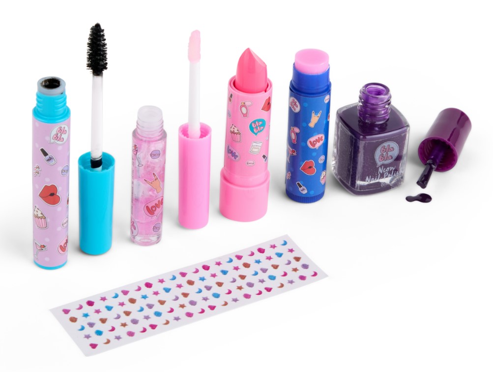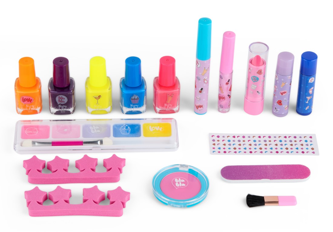 Ten kolorowy zestaw kosmetyków sprawi dużo frajdy każdej małej fance makijażu! Zestaw do makijażu Neon / Brokat zawiera szeroką gamę produktów do makijażu, w tym pięć kolorów lakieru do paznokci, tusz do rzęs,pilniczek, róż i wiele innych, dzięki czemu możesz bez końca eksperymentować i tworzyć własny, niepowtarzalny look!