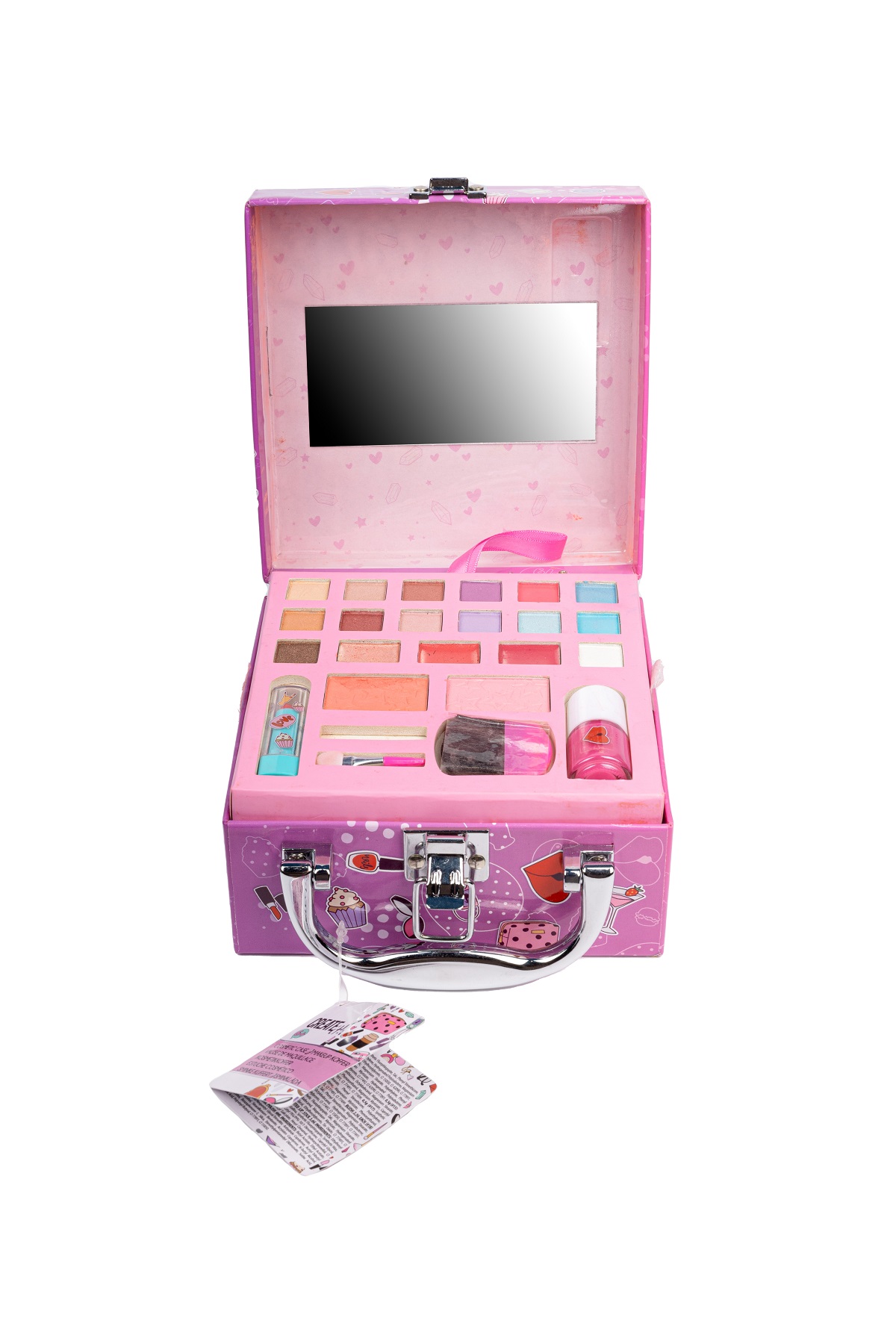 Kuferek z kosmetykami do makijażu od Create It! Kuferek wygląda jak spod pędzla profesjonalnej makijażystki, w środku znajdziemy 14 cieni do powiek, 3 błyszczyki, 2 róże, szminkę, lakier do paznokci oraz akcesoria potrzebne do zaaplikowania makijażu. Podczas otwierania kuferka wyłania się duże, wbudowane lusterko, które zdecydowanie ułatwi nam pracę. Na dnie znajduje się przestrzeń z przegródkami, gdzie możemy schować resztę naszych "skarbów".