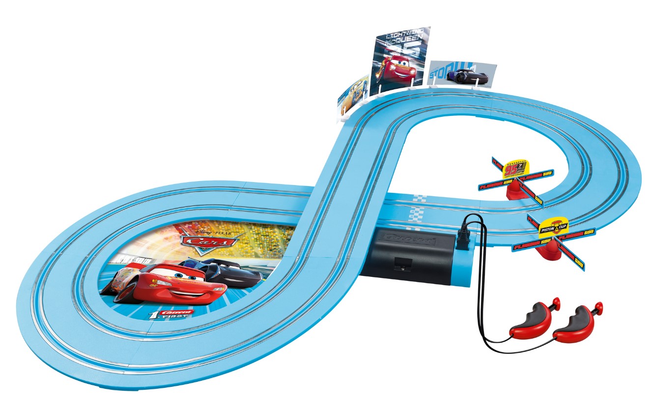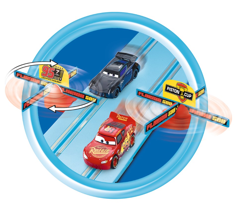 Zygzak McQueen i Jackson Storm rozpoczynają swoje ekscytujące przygody w Carrera First Disney Pixar Cars - Power Duel! Obaj są konkurentami na torze wyścigowym znanych filmów dla dzieci, ale pokazują, że mogą się razem bawić.