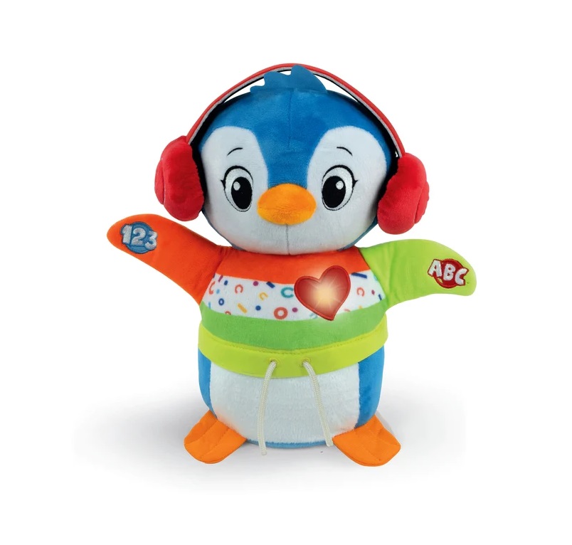 Dzięki dwóm przyciskom edukacyjnym uczy dzieci pierwszych cyfr, pierwszych liter i związanych z nimi słów, zabawiając je w rytm zabawnych piosenek i efektów świetlnych. Zwykłe klaśnięcie w dłonie sprawia, że pingwin zaczyna się poruszać i tańczyć, obracając się wokół własnej osi i zapraszając dziecko do naśladowania go. Zabawka, która rozbawi dzieci, a jednocześnie będzie stymulować rozwój zdolności motorycznych i języka.