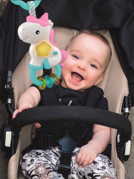 Magiczny jednorożec, który zabawia dziecko światłem i muzyką! Posiada lśniący przycisk w kształcie gwiazdki oraz kolorowe zawieszki, które wydają z siebie zabawne dźwięki. Posiada praktyczną obręcz, dzięki której grzechotkę można przymocować do kołyski lub wózka bądź też nosić przy sobie. Clementoni Baby to gama produktów skierowanych na pierwsze miesiące życia dziecka, które wspierają je i utrzymają w procesie rozwoju. Miękkie i kolorowe zabawki, które są idealne do stymulowania percepcji wzrokowej i sprawności manualnej u najmłodszych dzieci, z dużą ilością dźwięków melodyjek, które pomagają im rozwinąć percepcję słuchową.