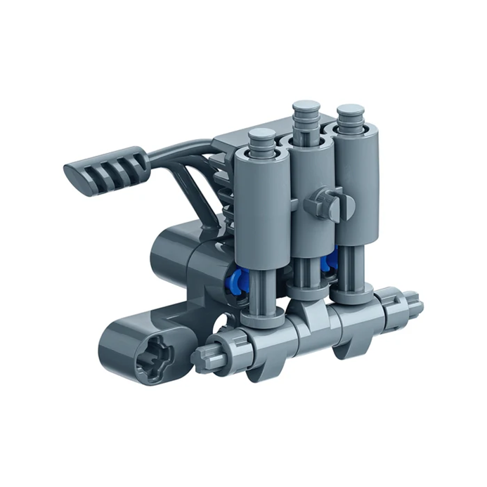 Złożony model ma koła zębate tworzące działający zaczep i odtwarza ruch naprzemienny tłoków, a całość jest połączona ze śrubą za pomocą przegubu cardana.