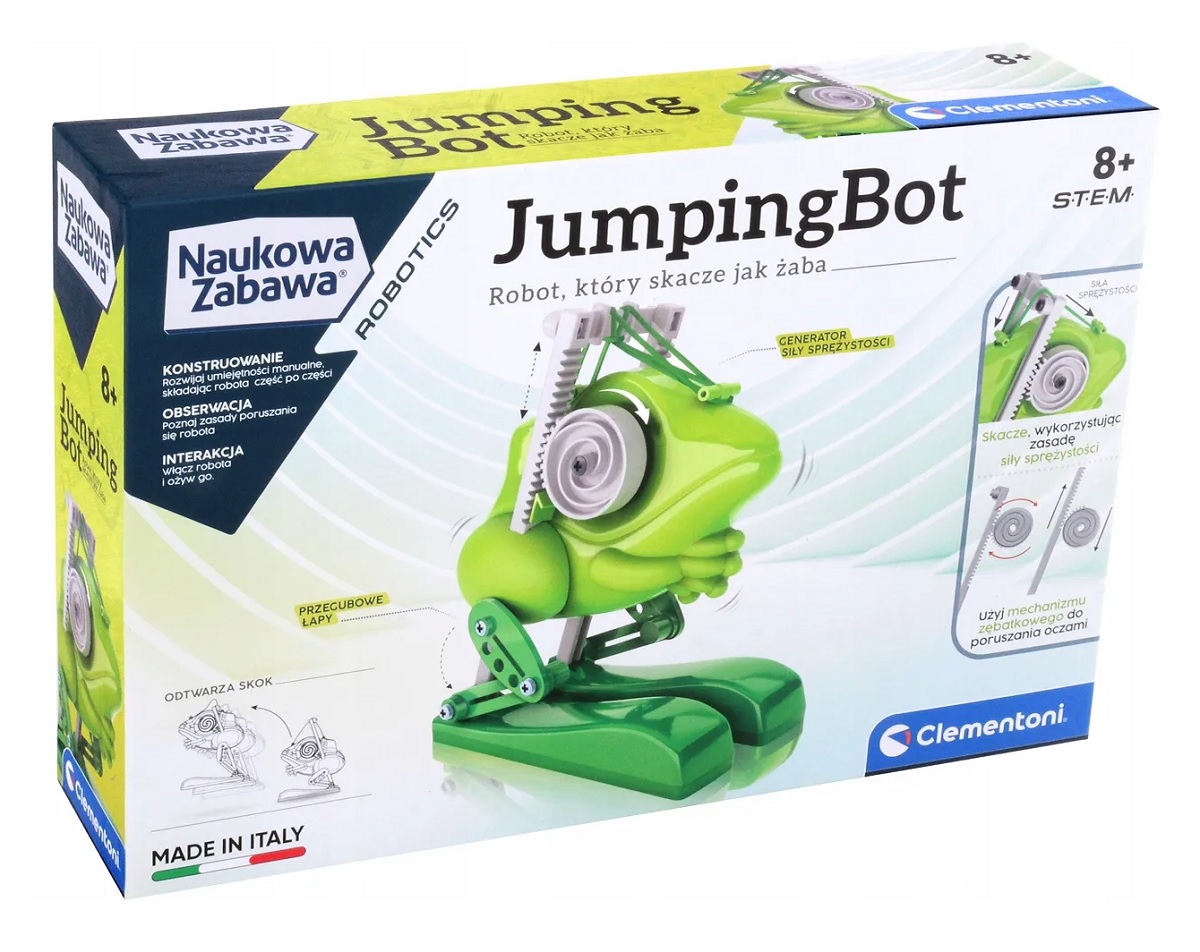 Ten niesamowity robot został zaprojektowany jako fantastyczny sposób na poznanie przez dzieci ekscytującego świata robotyki. Dzięki wysoce interaktywnym funkcjom, fajnemu kształtowi skaczącej żaby i solidnej konstrukcji nawet najbardziej entuzjastyczne dziecko będzie miało zajęcie na długie godziny. Robot do składania z silnikiem, który po włączeniu sprawia, że zabawka rzeczywiście skacze! Oko skaczącego robota obraca się, tworząc zabawny spiralny efekt optyczny.