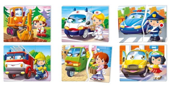 Puzzle pochodzące z serii Uczę się bawiąc! - składającej się z zabawek edukacyjnych dla dzieci charakteryzujących się bezpieczeństwem i wysoką jakością. Elementy zestawu Pojazdy i zawody zaprojektowano tak, by charakteryzowały się trwałością i wysoką odpornością. Puzzle składają się z elementów do łączenia w pary - dziecko ma za zadanie dobranie właściwego pojazdu do zawodu osoby przedstawionej na ilustracji.