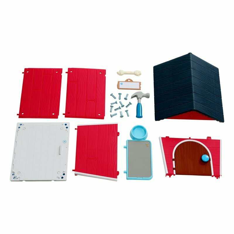 domek, interaktywny pluszak dalmatyńczyk, mata z miseczką na wodę, tabliczka z imieniem, zabawkowy młoteczek i gwoździki, zabawka kość, certyfikat adopcji i instrukcja.