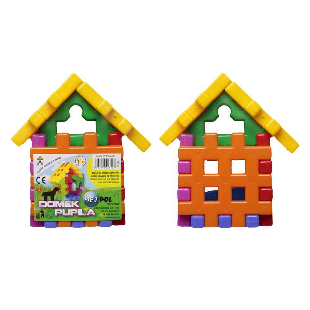 Zestaw klocków składa się z domku z klocków konstrukcyjnych oraz jednego zwierzątka - kotka lub pieska. Kształt i kolorystyka produktu sprawiają, że dziecko poprzez zabawę ćwiczy zdolności manualne, pamięć oraz wyobraźnię. Klocki wykonane zostały z miękkiego tworzywa, dzięki czemu są bezpieczne również dla najmłodszych dzieci.