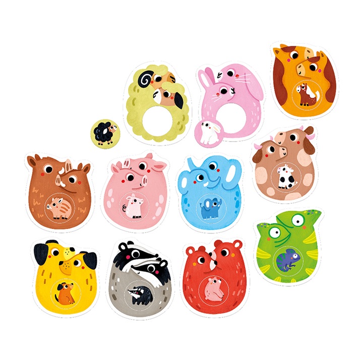 Każda z 11 dwuelementowych układanek posiada osobne kółeczka do dopasowywania, które dodatkowo angażują dziecko w aktywną naukę. Ilustracje przedstawiają różnorodne zwierzęce rodzinki, zachęcając do nazywania i opowiadania historii, co wspiera rozwój językowy i kreatywność najmłodszych.