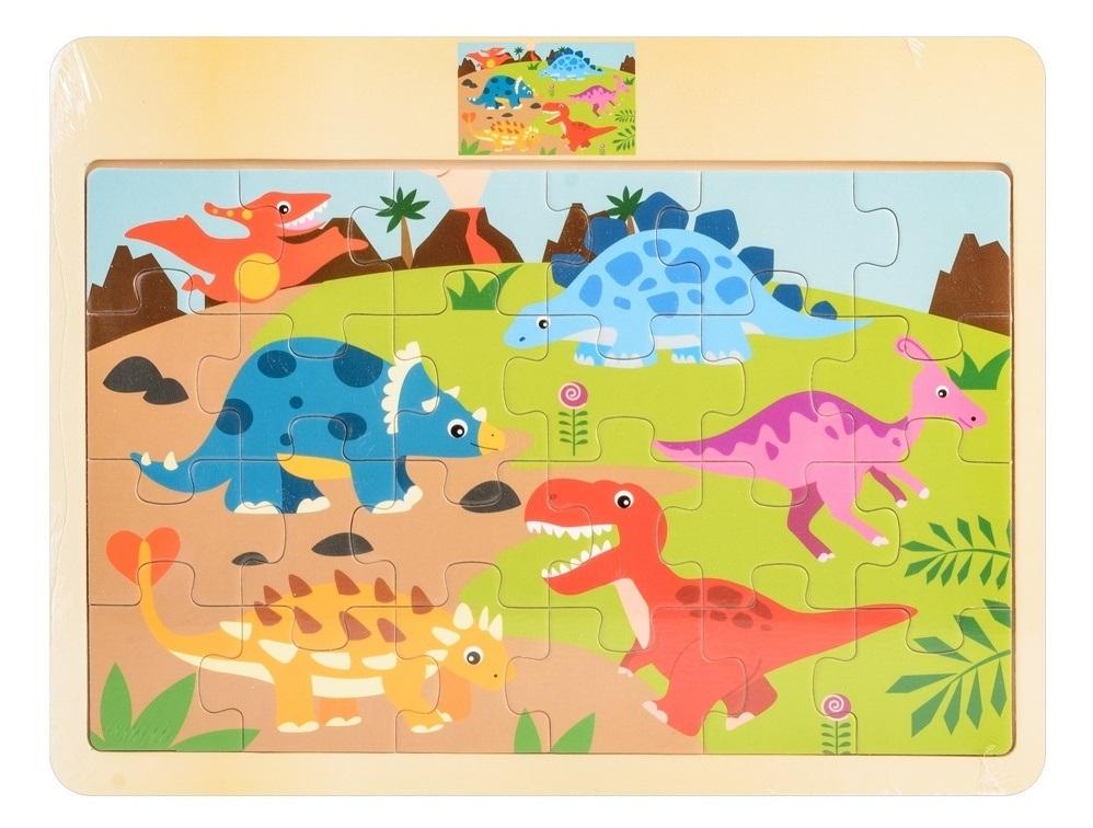 Edukacyjna układanka drewniana dla dzieci przedstawiającą dinozaury rozwija spostrzegawczość i koordynację wzrokowo-ruchową. Puzzle z uchwytami uławiają ich przenoszenie.