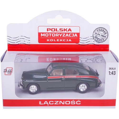 Pierwsza Warszawa M-20 zmontowana z części sprowadzonych z ZSRR zjechała z taśmy montażowej 6 listopada 1951 roku o godzinie 14:00. Początkowe plany zakładały produkcję na poziomie 25 000 sztuk rocznie, do końca roku 1951 powstało jednak jedynie 75 egzemplarzy. W początkowym okresie produkcji samochód montowany był z części radzieckich, dopiero 19 września 1953 roku zmontowano silnik M-20 w całości z części polskich. W 1954 roku rozpoczęto również eksport. Początkowo samochód trafiał do Chin, Rumunii, Albanii oraz Bułgarii. W oparciu o podzespoły dedykowane dla Warszawy skonstruowano także samochody dostawcze: Żuka, Nysę oraz Tarpana. Samochody te były wykorzystywane do dostarczania przesyłek pocztowych. Pojazd wykonany z metalu z elementami plastikowymi, w skali 1:43.