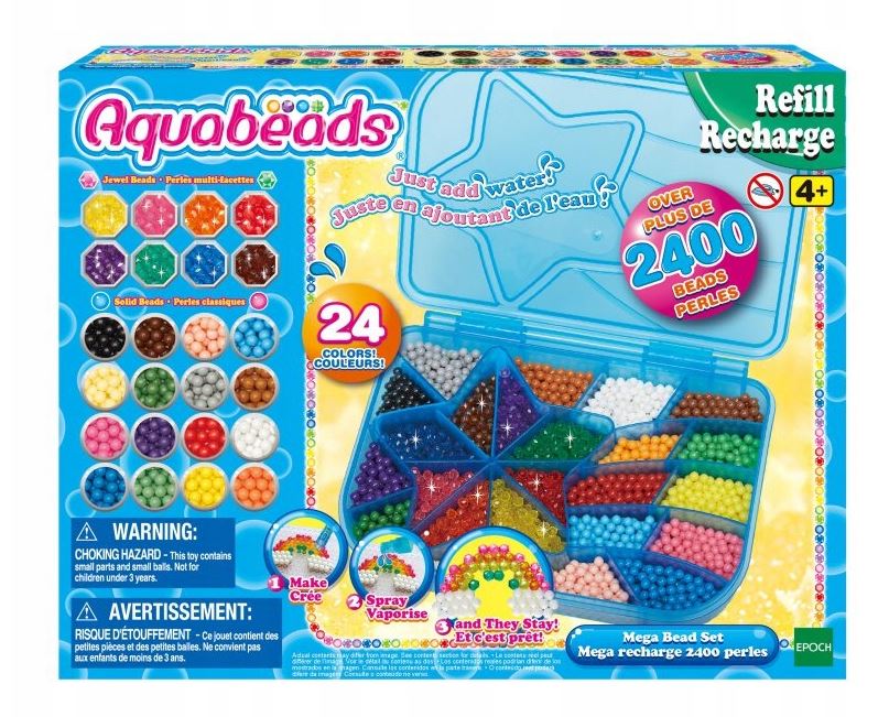 Wielki zestaw koralików zapewni wiele wyjątkowej i kreatywnej zabawy, nawet najbardziej wymagającym miłośnikom Aquabeads. Opakowanie zawiera 2400 koralików w 24 różnych kolorach oraz wygodną szkatułkę do przechowywania i transportu koralików. W zestawie znajduje się 8 różnych kolorów koralików-klejnocików oraz 16 kolorów koralików podstawowych. Wielki zestaw uzupełniający koralików jest idealny dla dzieci, które posiadają zestaw akcesoriów niezbędnych do tworzenia kreacji. Akcesoria można nabyć osobno lub w innych, gotowych do zabawy zestawach. Oryginalne zabawki Aqubaeads od Epoch zapewniają bezpieczną zabawę bez potrzeby użycia żelazka. Koraliki połączą się w magiczny sposób po spryskaniu wodą. Zabawki Aquabeads polecamy dla dzieci od 4 roku życia.