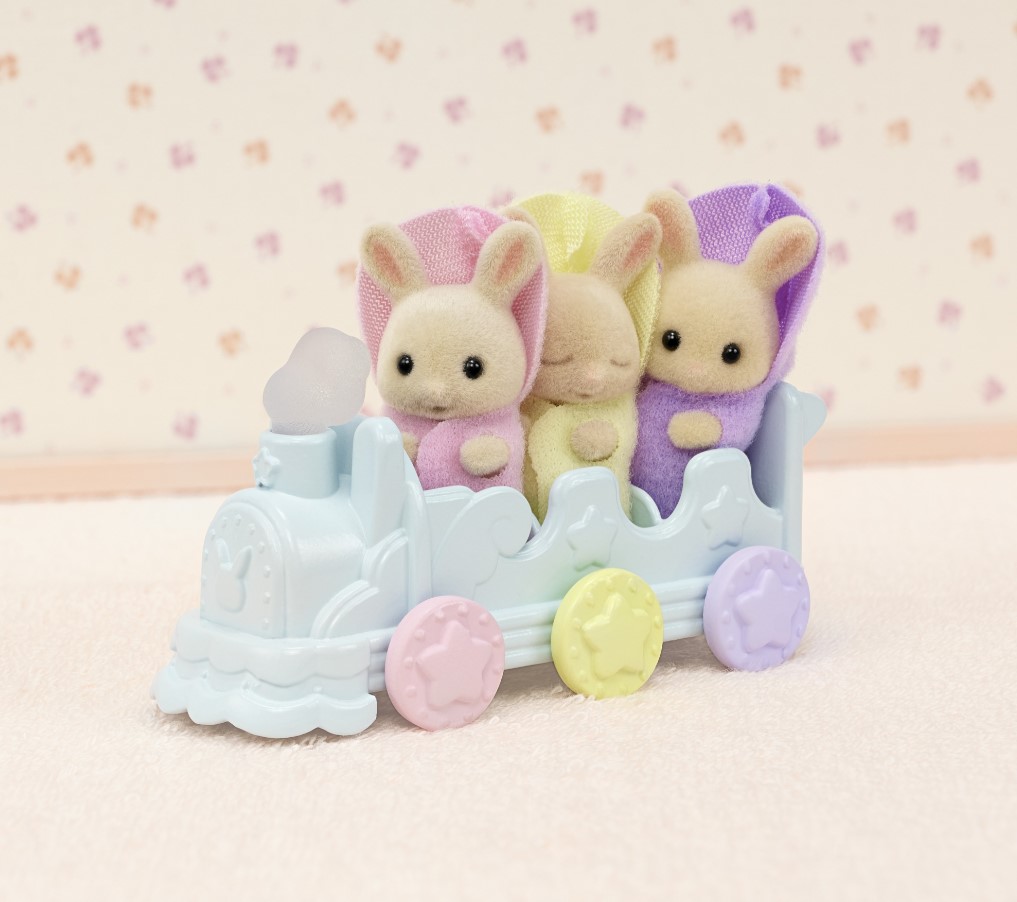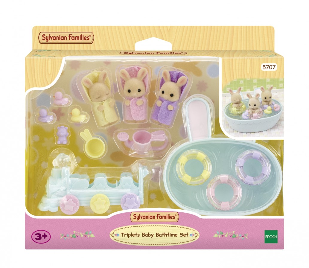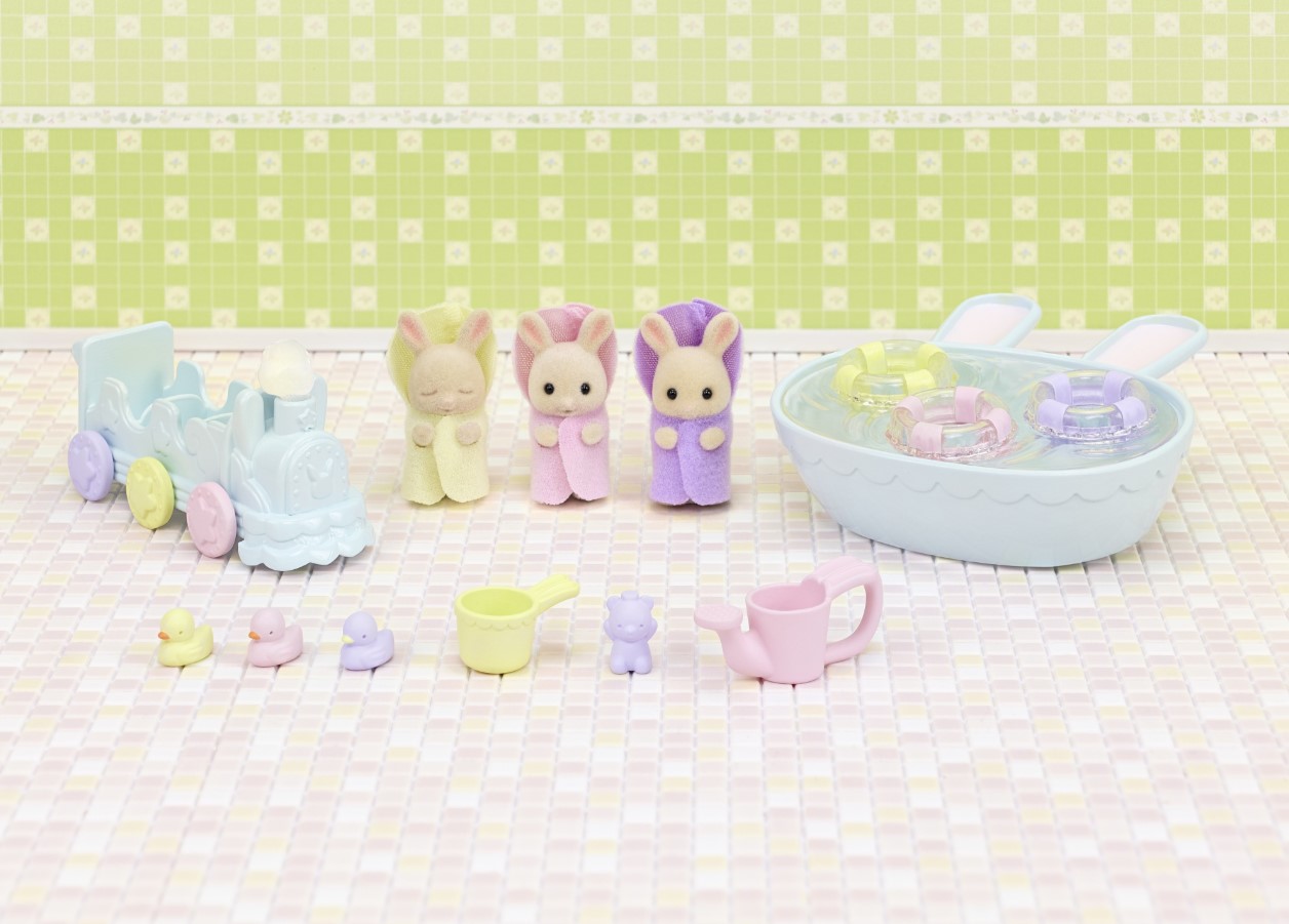 Zestaw „Biszkoptowe króliki w kąpieli” Sylvanian Families zawiera trojaczki z rodziny biszkoptowych królików. Urocze biszkoptowe króliki Isla, Iris i Owen, które są trojaczkami, cieszą się zawsze, gdy nadchodzi dzień kąpieli. Isla uwielbia pluskać się w wannie. Iris to wielki śpioch. Śpi nawet w wannie. Owen uwielbia pociągi. Gdy nie ma ochoty iść się kąpać, mama daje mu do wanny jego pociąg. W pociągu jest miejsce dla wszystkich trojga maluchów. W wannie maluchy mają także kółka do pływania i kąpielowe kaczuszki.