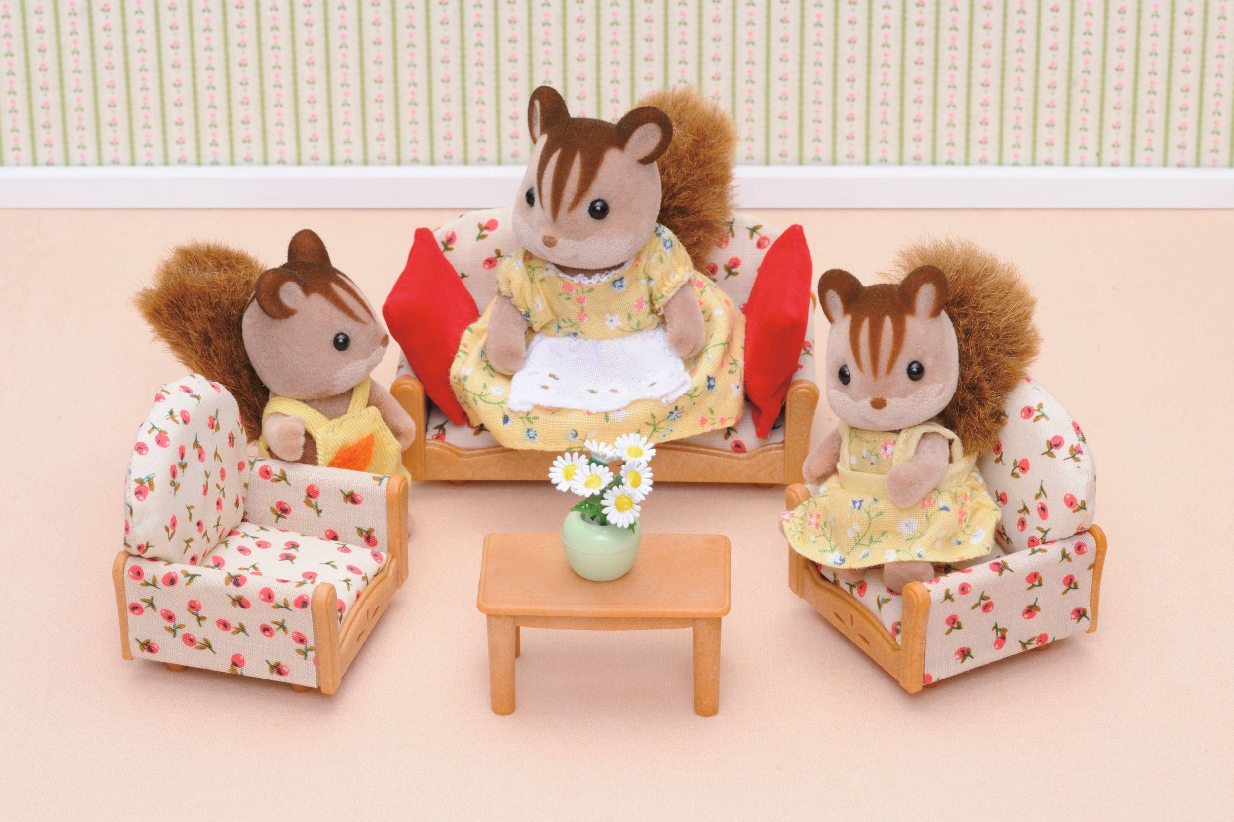 Trójelementowy zestaw wypoczynkowy Sylvanian Families to popularny zestaw mebli do domku dla lalek Sylvanian Families. W miasteczku Sylvanian Village znajomi zawsze wpadają do siebie z wizytą, tu na herbatkę, tam podzielić się zebranymi rankiem kwiatami, a jeszcze gdzie indziej po prostu, by wymienić uprzejmości. Oznacza to, że w żadnym z sylvańskich salonów nigdy nie ma zbyt wiele miejsc do siedzenia! Ten piękny trójelementowy zestaw zawiera kanapę z 2 dopasowanymi fotelami - wszystkie ozdobione uroczym wiejskim wzorem w kwiaty oraz ślicznymi detalami w kształcie kropli na zakrzywionych ramach imitujących drewno. W zestawie znajduje się stolik kawowy wykonany z tego samego drewna, a na jego blacie stoi śliczny bukiet stokrotek świeżo zerwanych na łące! Dwie jaskrawoczerwone poduszki również są w zestawie, dodając kolorystyczny akcent do Twojego sylvańskiego salonu.