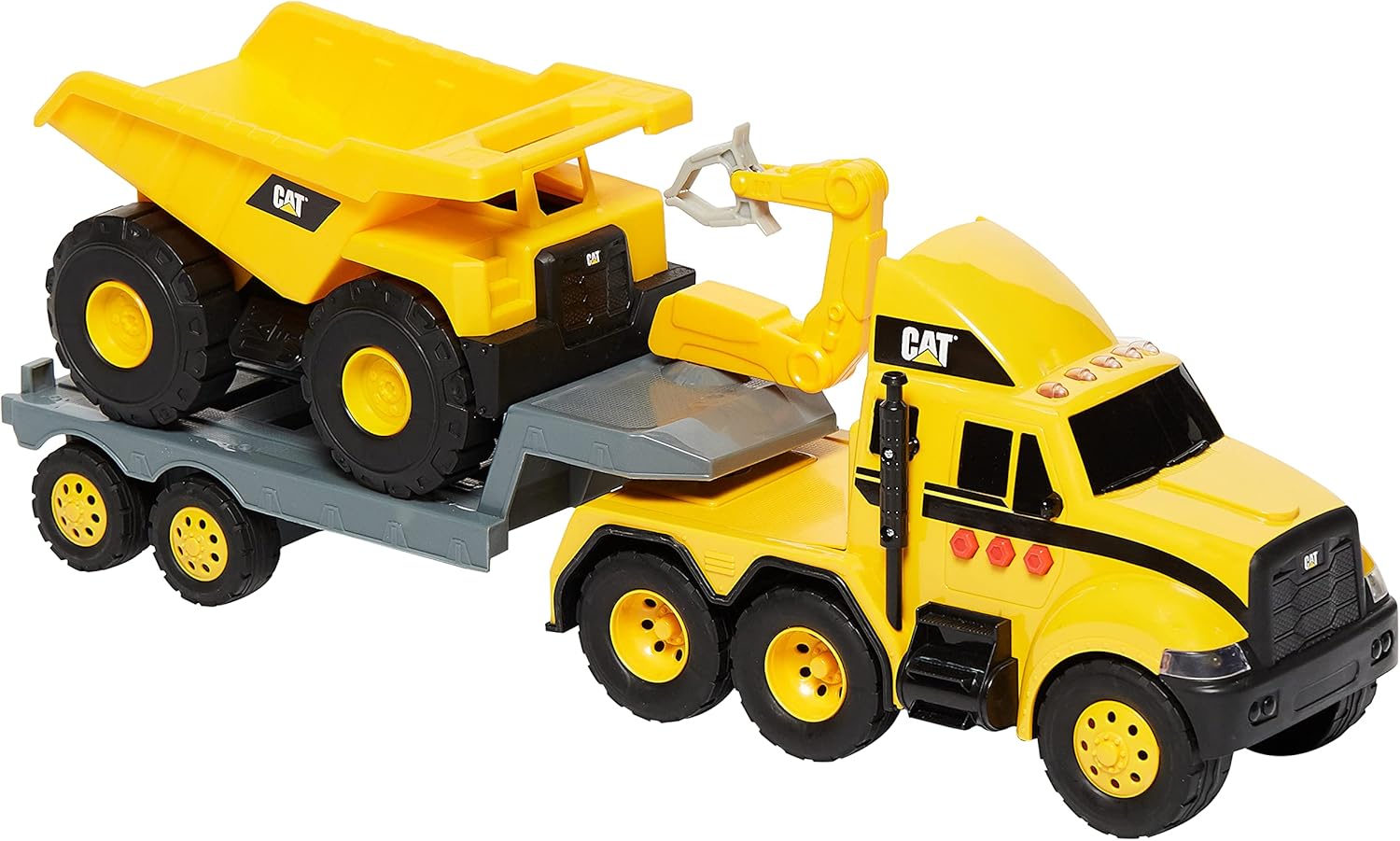 Laweta z ładowarka kołową CAT z funkcjami światła i dźwięku to idealna zabawka dla dzieci, które fascynują się pojazdami budowlanymi.