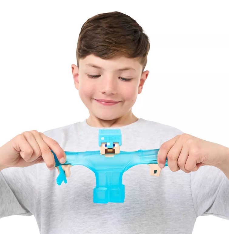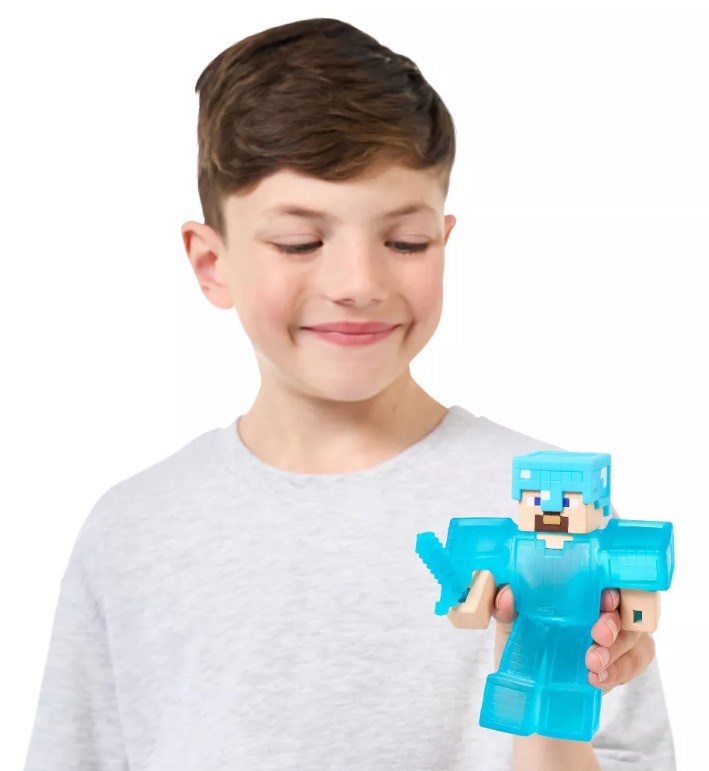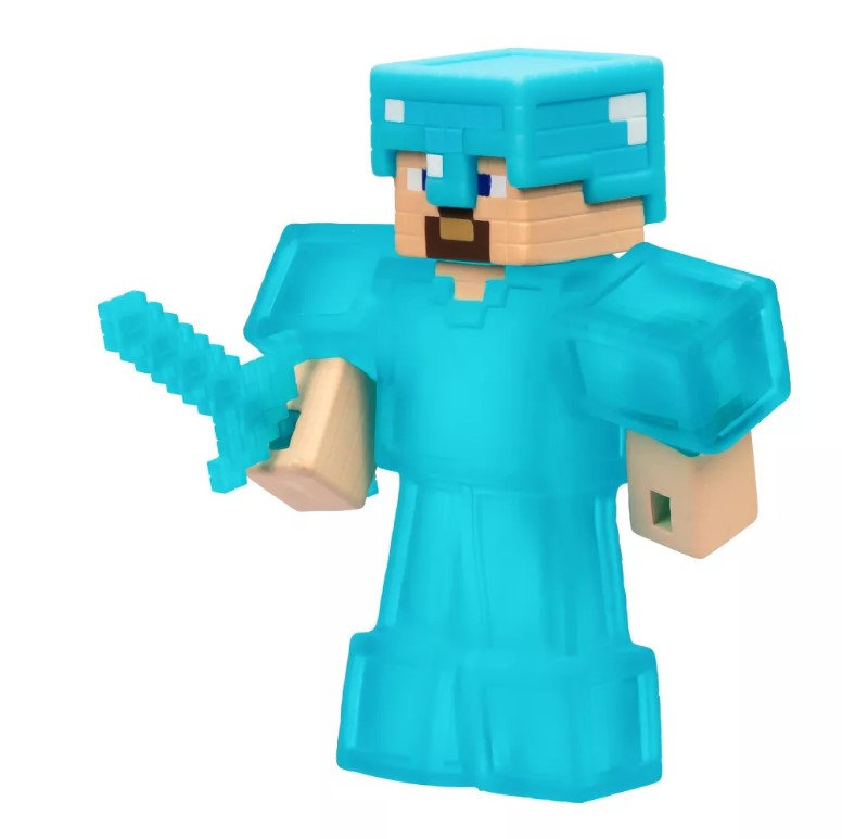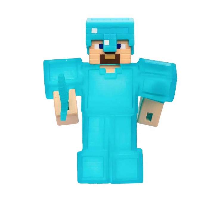 Przygotuj się na super rozciągliwą akcję z figurką Stevea z Minecraft z diamentową zbroją i mieczem. Steve jest super miękki, można go rozciągnąć aż trzykrotnie!