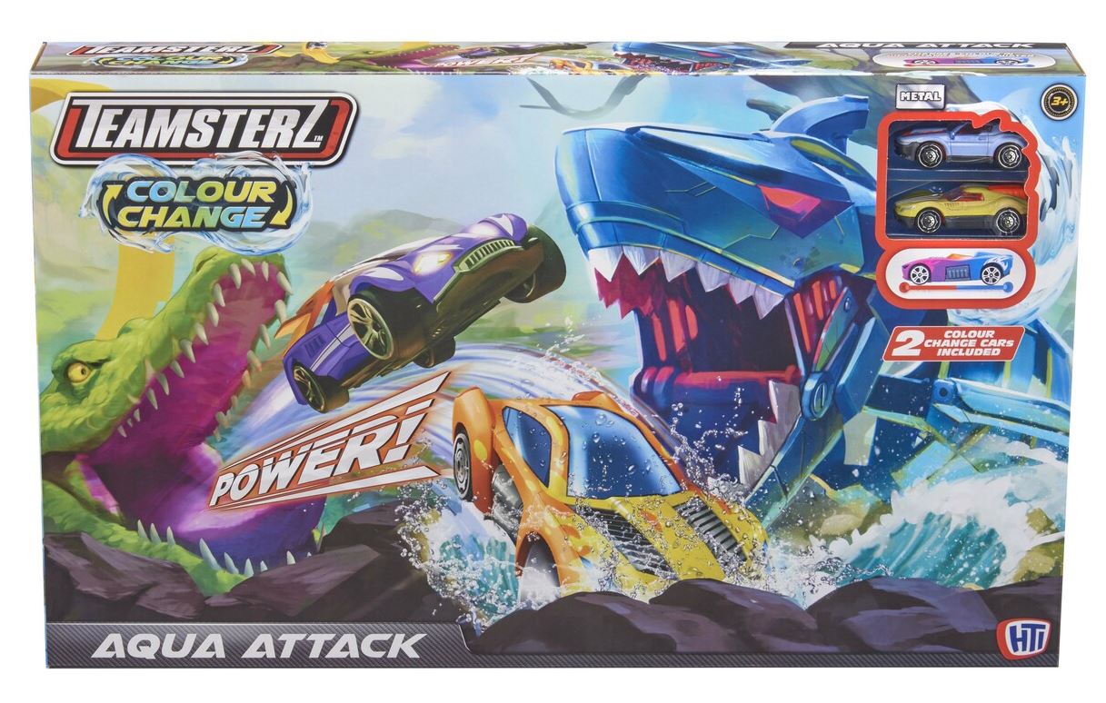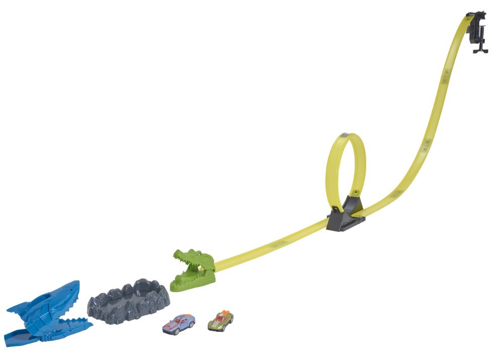 Pędź po torze, okrąż pętlę i przejedź przez szczęki rekina, zanim wylądujesz w wodzie, która zmienia kolor samochodu, ale uważaj - po drugiej stronie czai się ogromny krokodyl! Samochody pokryte są specjalnym lakierem, który po zanurzeniu w ciepłej/zimnej wodzie powoduje zmianę koloru! To idealny produkt dla każdego zapalonego małego kierowcy, który oferuje godziny pomysłowej zabawy. Zabawka wspomaga rozwój i zdolności motoryczne dziecka. W zestawie znajduje się 1 rekin, 1 krokodyl, 1 rampa, pojemnik na wodę oraz 2 auta.