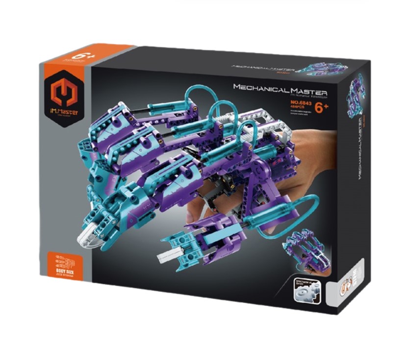 Klocki przedstawiają bioniczną dłoń w kolorze fioletowym, reagującą na ruchy dłoni ludzkiej.