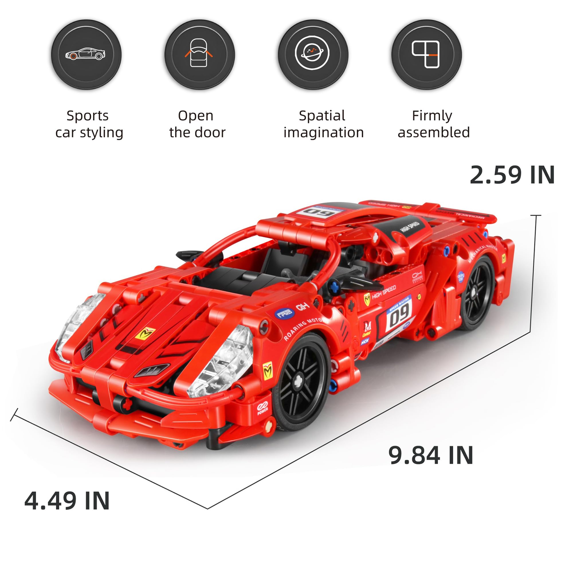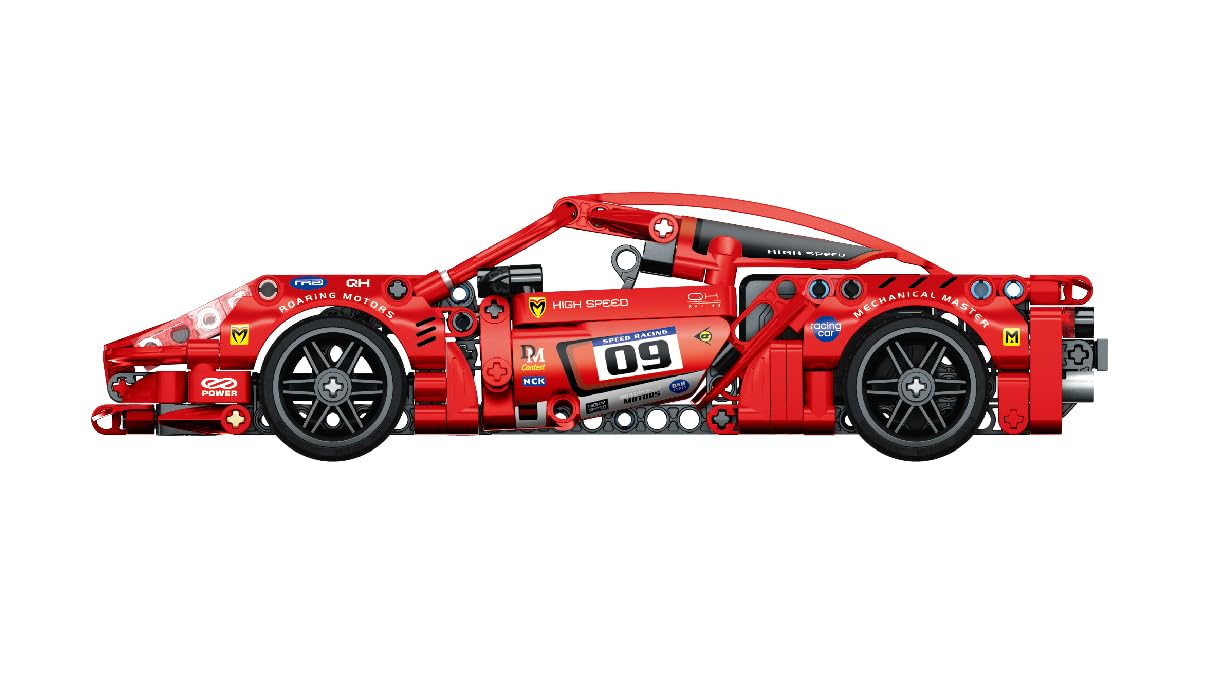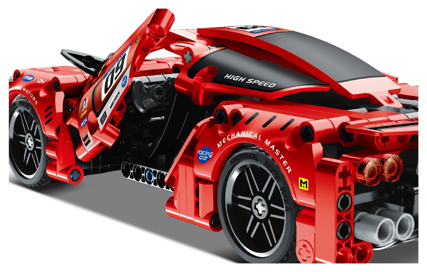 Klocki przedstawiają auto wyścigowe w kolorze czerwonym, wyposażone w funkcję pull and back. Zestaw składa się z 437 elementów.