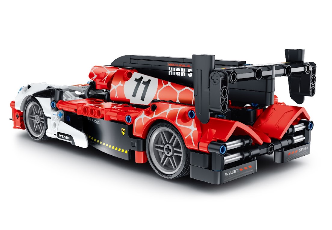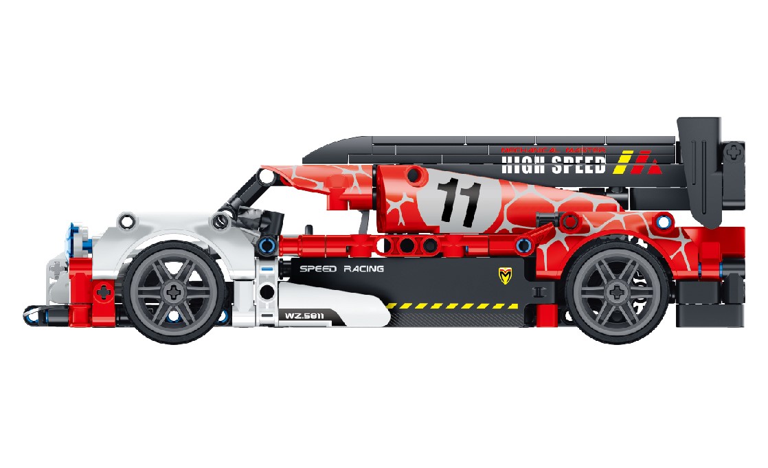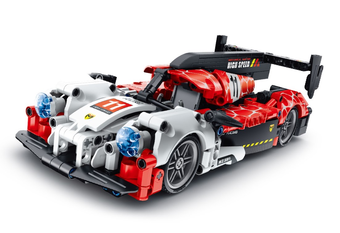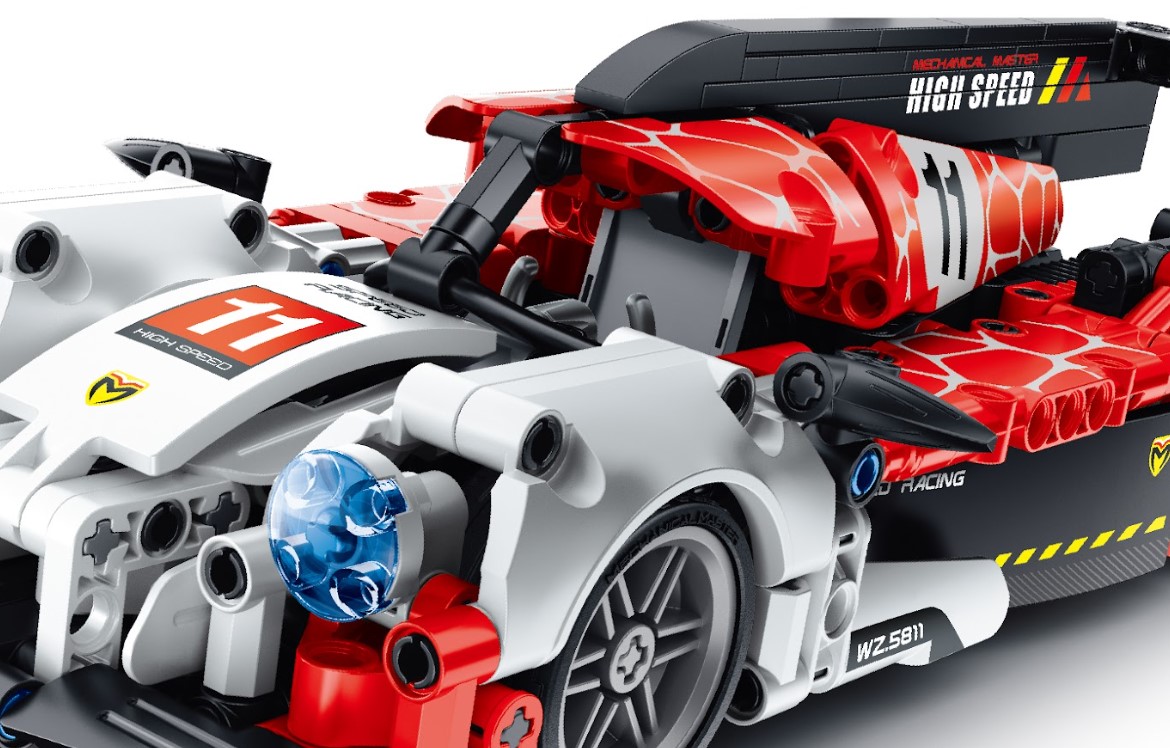 Klocki przedstawiają super wyścigówkę w kolorze czerwonym, wyposażoną w funkcję pull and back. Zestaw składa się z 472 elementów.
