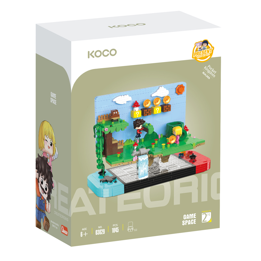 Klocki marki KOCO składające się z 1045 elementów, przedstawiają grę platformową.