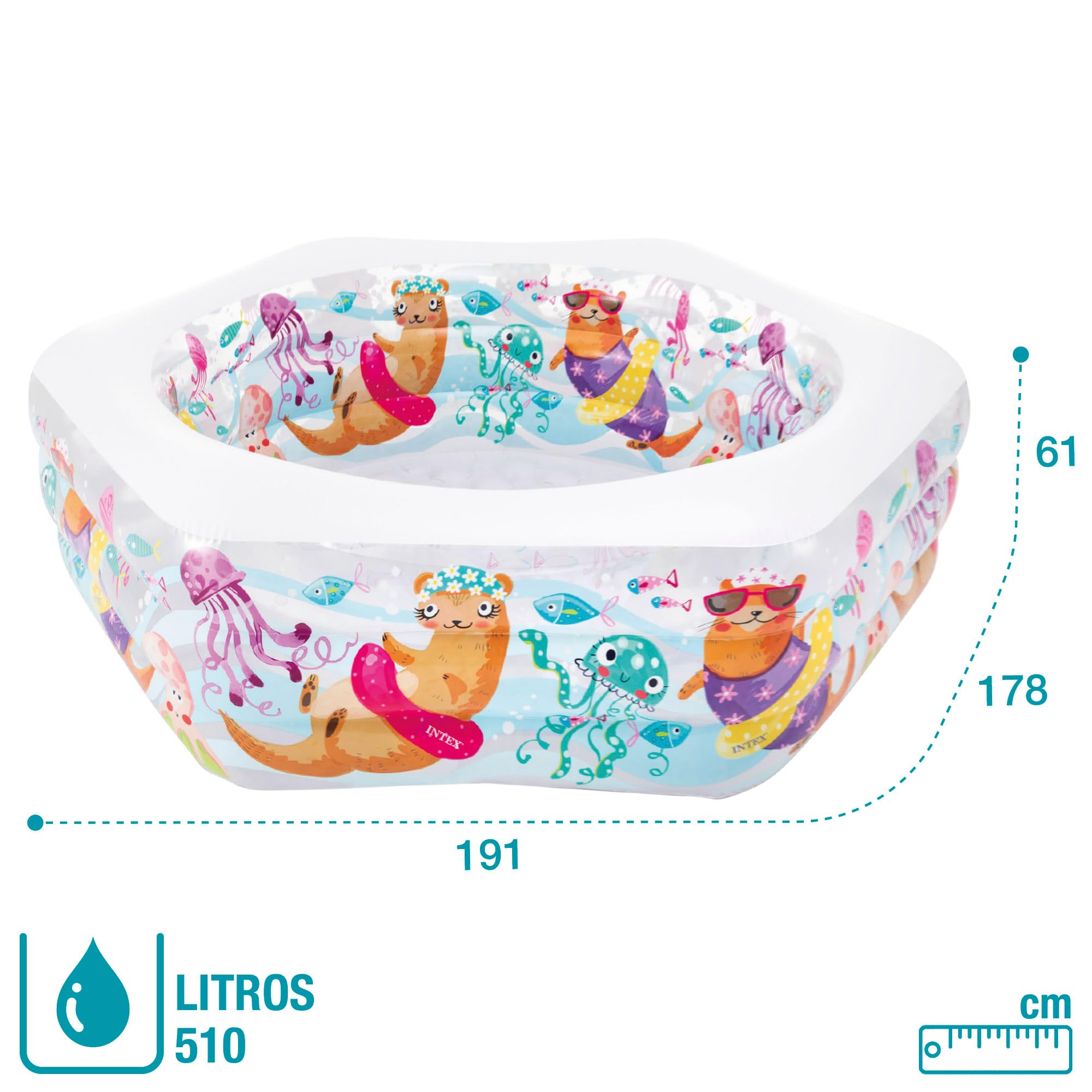 Basen firmy Intex z nadrukiem rafy koralowej z nadmuchiwaną podłogą. Dzięki podwyższonym ściankom dzieci znajdą okazję do nurkowania. Sześciokątny kształt i pompowana podłoga to także zaproszenie dla dorosłych aby razem z dziećmi mogły spędzać wesoło czas. Motyw rafy koralowej to dodatkowa atrakcja dla Waszych pociech.