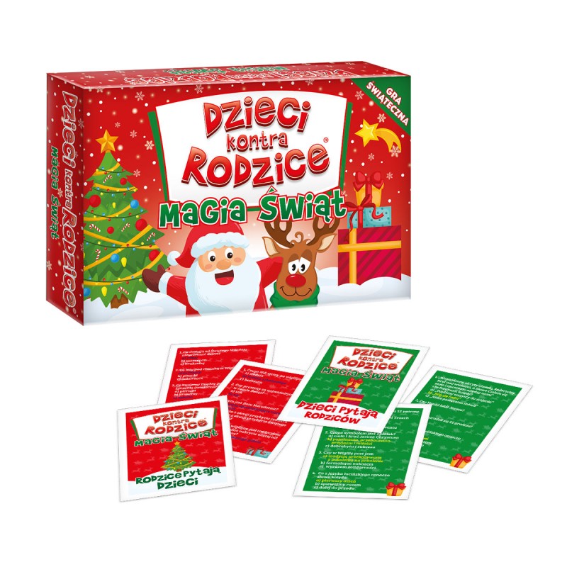 Czym jeździ Mikołaj? Czego szukamy na niebie? Ile mamy potraw? Z czym są świąteczne pierogi? Wesoła gra, która przybliży Wam piękną atmosferę Świąt. Dzieci rywalizują z Rodzicami. W grze znajdziecie pytania specjalnie przygotowane dla Dzieci i dla Rodziców.