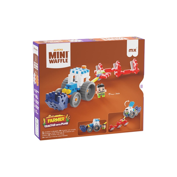 Zestaw Mini Waffle Farmer to nie tylko zabawka – to sposób na rozwijanie wyobraźni i kreowanie niesamowitych historii. Twoje dziecko będzie mogło poczuć się jak prawdziwy farmer, bawiąc się klockowym traktorem z pługiem.