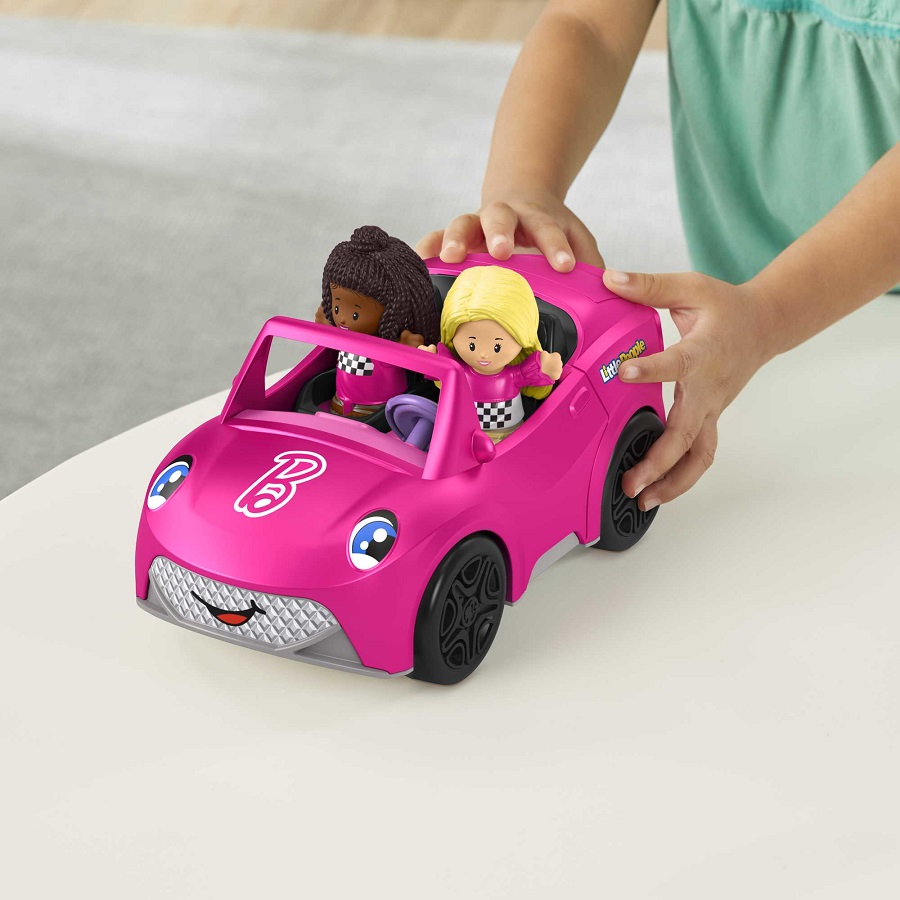 Klasyczny kabriolet Barbie został zmniejszony do rozmiaru zabawki Little People, aby umożliwić maluchom zabawę z tym uroczym pojazdem i zestawem figurek od Fisher-Price. Kiedy dzieci wcisną jedną z figurek Little People na siedzenie kierowcy samochodu, usłyszą wesołą muzykę i dźwięki. Dopasowany rozmiarem do małych rączek, ten kabriolet mieści obie figurki i posiada charakterystyczny dla Barbie kolor.