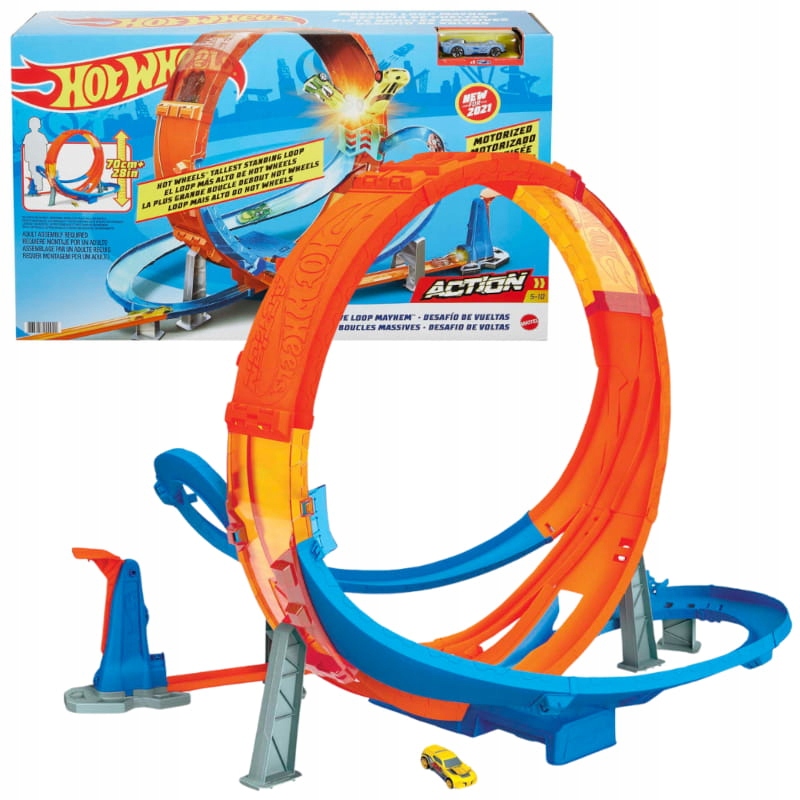 Czas na ekstremalną jazdę po gigantycznej pętli! Hot Wheels Gigapętla wznosi się na wysokość aż 70 cm, a dzięki napędzanej wyrzutni i specjalnemu przyspieszaczowi pozwala utrzymać samochodziki w nieustannym ruchu.