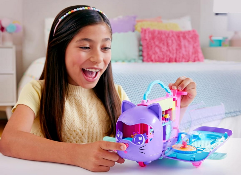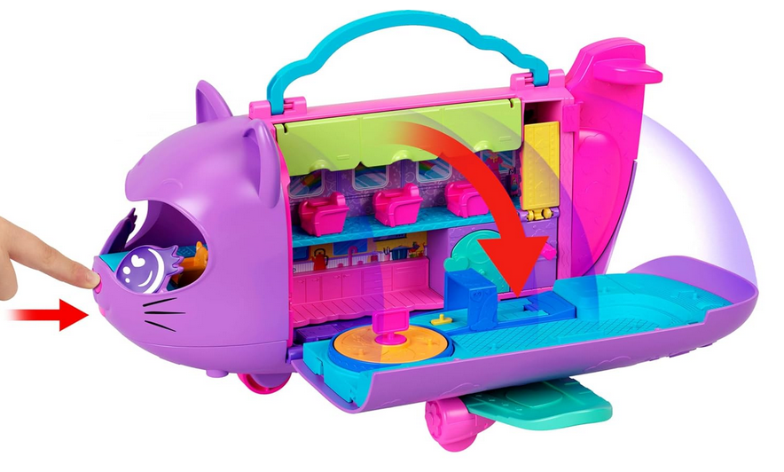 Kotolot Polly Pocket jest gotowy do startu i odlotowej zabawy! Mali podróżnicy mogą poszybować na skrzydłach wyobraźni z tym wspaniałym zestawem z 2 mikrolalkami i 19 akcesoriami. Uroczy koci samolot do zabawy po otwarciu odsłania kilkupoziomowe wnętrze. Możesz pilotować samolot, zasiąść w fotelu pasażera lub odegrać obie te role. Lalki mogą włożyć bagaże do schowków nad głową i zająć miejsce przy oknie lub skorzystać z łazienki. Zapinamy pasy – czas poszybować ku przygodom! Serwuj „napoje” i „przysmaki” z wózka, jak w prawdziwym samolocie. Podróż może zamienić się w imprezę taneczną – lalki i kotek mają obrotową scenę do występów! Po skończonej zabawie złóż zestaw i zabierz go, gdziekolwiek chcesz. Doskonały prezent dla dzieci od 4 roku życia. Kolory i elementy dekoracyjne mogą się różnić.