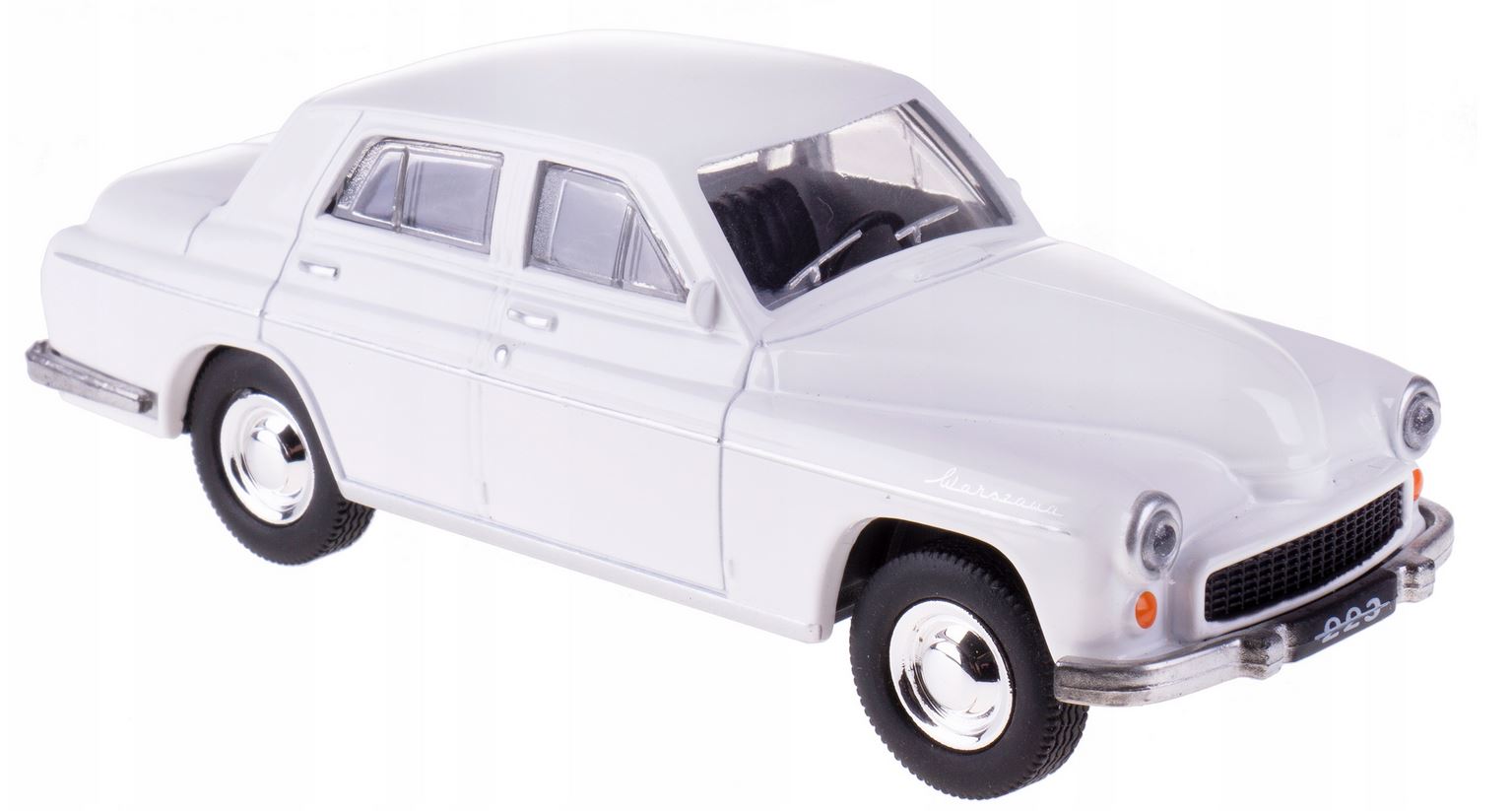 Historyczny samochód produkowany w czasach PRL-u. Model metalowy z elementami plastikowymi. Detale wiernie odwzorowane względem oryginału. Skala 1:43. W 1961 roku skonstruowano trzy prototypy Warszawy z nadwoziem typu sedan. Była to modernizacja Warszawy M-20 (i późniejszych wersji). Zmieniono tylną części nadwozia oraz konstrukcję dachu. Dwie kanapy pokryte skajem i tkaniną zapewniały wysoki komfort podróży. Produkcję rozpoczęto w 1964 roku. Od 1970 roku montowano czterobiegową ręczną skrzynię biegów z dźwignią zamontowaną w podłodze. Tak wyposażone egzemplarze trafiały głównie na eksport (rynek kolumbijski). Równocześnie montowano także skrzynię 3-biegową. Początkowo model ten był oznaczony liczbą 203, jednak po proteście firmy Peugeot (miała zastrzeżone dla oznaczeń swoich aut trzycyfrowe liczby z zerem pośrodku) zmieniono na 223.