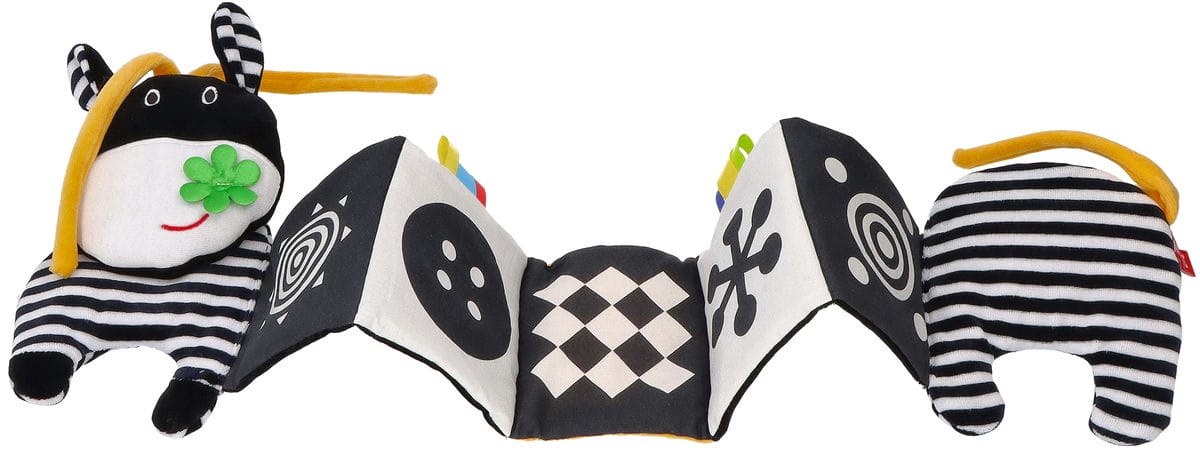 Mięciutka, materiałowo-harmonijkowa książeczka kontrastowa Króweczka Momcare została stworzona z myślą o najmłodszych. To właśnie w pierwszym okresie życia dziecka kluczową rolę odgrywa stymulacja zmysłów. Wodzenie spojrzeniem i wpatrywanie się w zabawki rozwija zmysł wzroku oraz spostrzegawczość malucha. Do uszycia książeczek sensorycznych używamy bezpiecznych, przyjemnych w dotyku materiałów o różnej strukturze, które z pewnością zaciekawią badawcze paluszki. Dzięki temu dziecko poznaje świat i stymuluje zmysł dotyku. Nie zapominamy także o prawidłowym rozwoju zmysłu wzroku. Przewaga biało-czarnych, szeleszczących ilustracji trenuje spostrzegawczość i koordynację ruchową oko-ręka. Wraz z upływem czasu dziecko widzi coraz lepiej, więc można sięgać po zabawki w innych kontrastujących barwach.