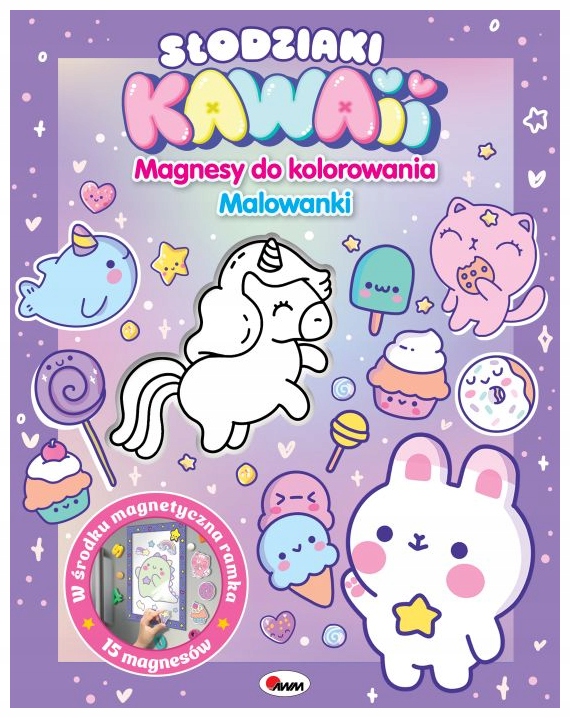 Odpowiedź: Zestaw zawiera magnetyczną ramkę oraz 15 magnesów do kolorowania z motywami słodziaków kawaii.