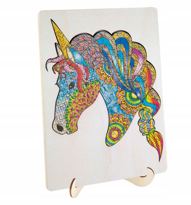 Wyjątkowe puzzle wykonane z drewna, przedstawiające barwnego jednorożca, zachwycają precyzją i unikalnym designem.
