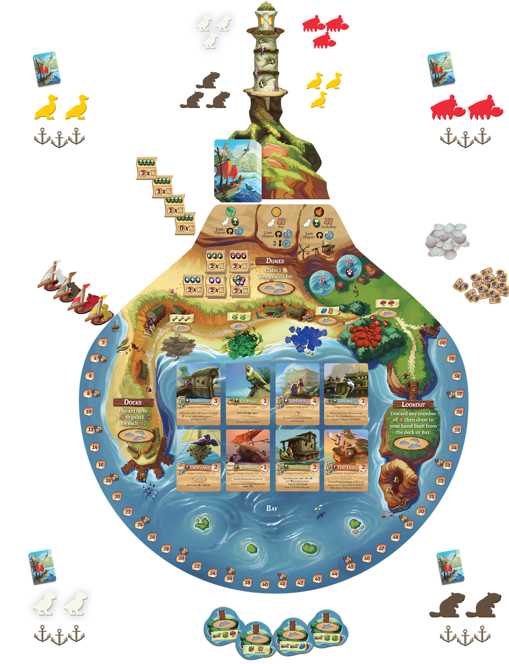 Everdell: Dalekobrzeg to wielowymiarowa gra, która pozwala na wypróbowanie różnych strategii dzięki zmienności elementów. Odkrywaj nowe możliwości z każdą rozgrywką, a także korzystaj z nowych stworzeń takich jak kraby, bobry, maskonury czy kaczki!