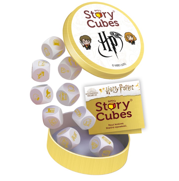 Oto prosta w założeniach i jednocześnie genialna gra, która dostarczy Wam wiele radości, stanowiąc przy tym doskonały trening pomysłowości i wyobraźni. Story Cubes: Harry Potter to 9 estetycznie wykonanych, sześciennych kostek, z których każda zawiera na ściankach odmienny zestaw ilustracji w szlachetnym, złotym kolorze.