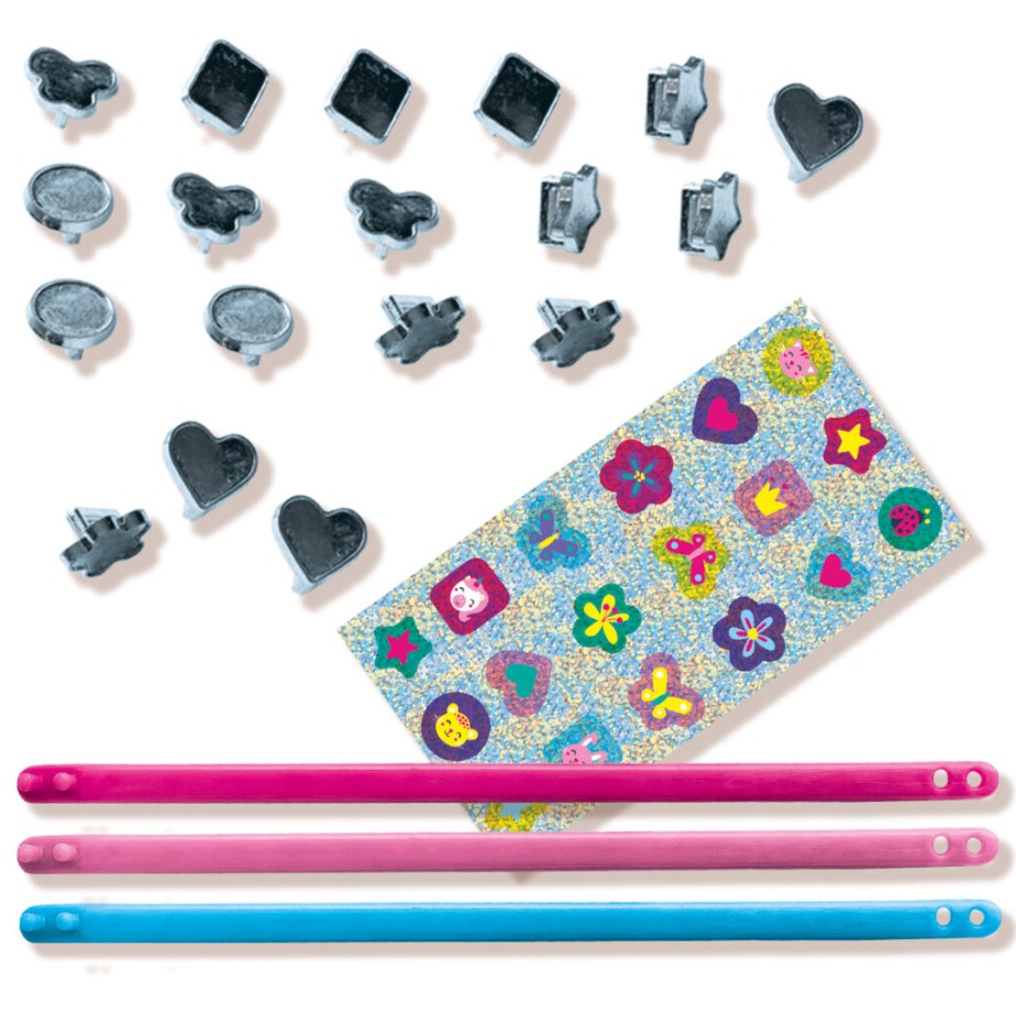 Tworzenie własnej biżuterii nie musi być trudne! Wystarczy przykleić błyszczące brokatowe naklejki na charmsach i wsunąć je na jedną z trzech plastikowych bransoletek. Wymieszaj i dopasuj własne kombinacje, zsuń je i stwórz coś nowego! Każdego dnia możesz mieć inny wzór na nadgarstku.
