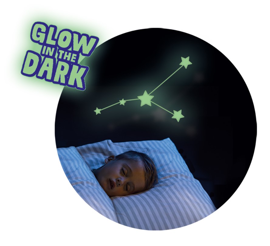 Zestaw zawiera różne naklejki z gwiazdami i świecącą w ciemności taśmę, którą można przymocować do ściany. Skorzystaj z instrukcji, aby łatwo stworzyć wszystkie dwanaście konstelacji znaków zodiaku!