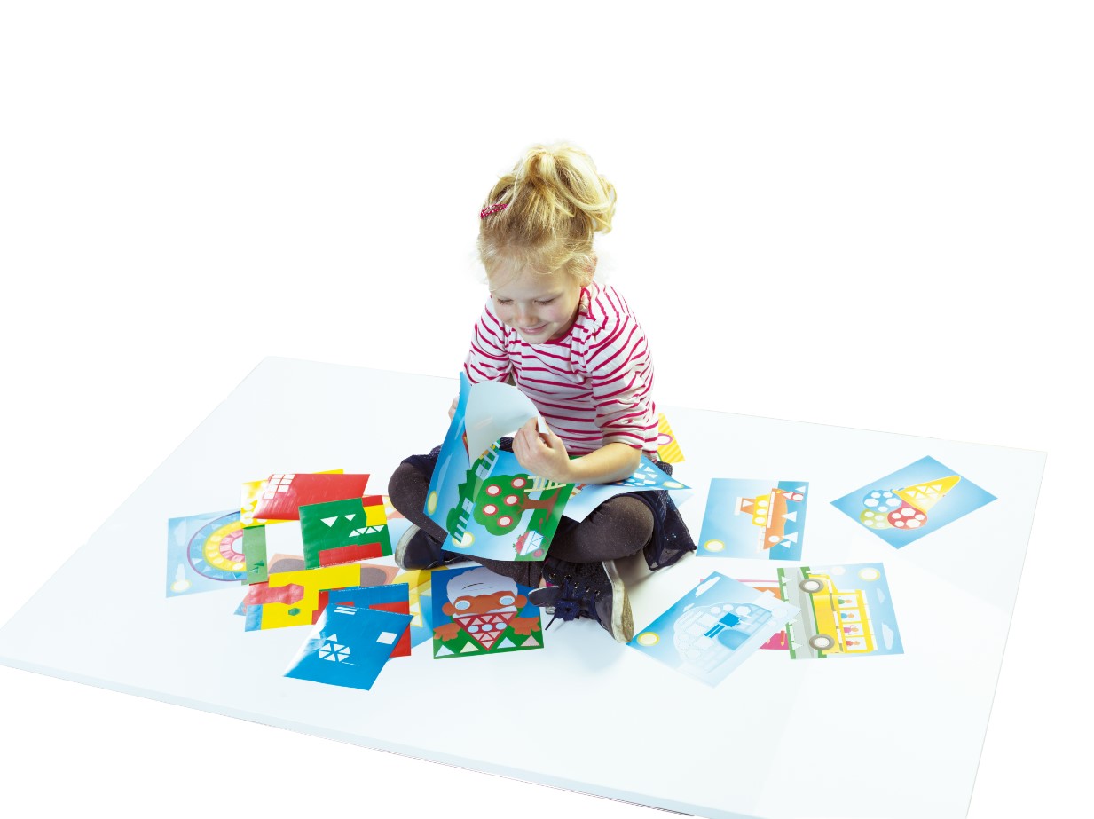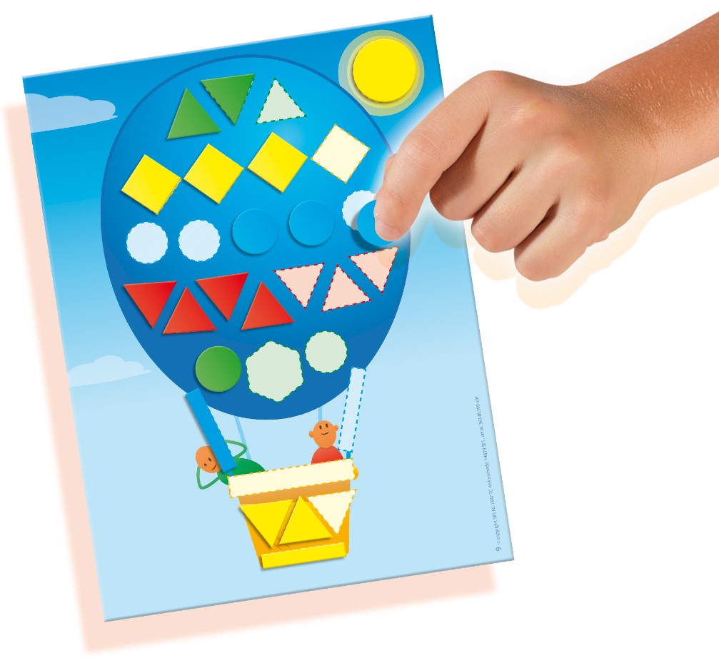 Rozpoznawanie różnych kształtów. Jaki kształt mają koła autobusu? A piramida czy okna wieżowca? Poszukaj odpowiedniego kształtu w odpowiednim kolorze i przyklej go na arkuszach (patrz linia przerywana). Wkrótce zaczniesz dostrzegać kształty wszędzie wokół siebie.