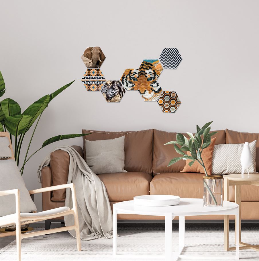 Wyjątkowy zestaw własnoręcznie wykonanych płytek heksagonalnych z prasowanych koralików w połączeniu z płytkami fotograficznymi to piękna i współczesna mozaika do Twojego wnętrza. Możesz sam ustalić kolejność płytek. Pasuje więc do każdej ściany, czy to wąskiego przedpokoju, czy szerokiej ściany nad sofą.